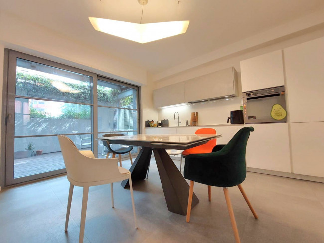 Soluzione indipendente di recente costruzione con vista parco. La soluzione si dispone su più livelli cosi disposti: Piano terra: si sviluppa su un unico piano la zona living open space con soffitti alti fino a 6 metri e vetrate da cui si irradiano notevoli quantità di luce naturale. La zona living e la cucina insistono in un ambiente che si estende verso un Patio a cielo aperto di proprietà, quest'ultimo pavimentato in doghe di legno. E' presente sempre al piano terra un bagno padronale di buone dimensioni. Piano primo: dedicato alla zona notte, con una camera da letto matrimoniale con bagno privato e grande balcone che affaccia sul parco, il locale soppalcato che è utilizzato come un disimpegno multiuso dal design molto particolare. Dal primo piano i proprietari e gli ospiti possono salire al terrazzo di copertura privato rappresentato da un esclusivo giardino con prato all'inglese in erba sintetica. La vivibilità e comodità del complesso è garantita dalla presenza di una cantina di pertinenza, inclusa nella richiesta, ed un box privato di grandi dimensioni, in aggiunta al prezzo di €50.000 a parte.